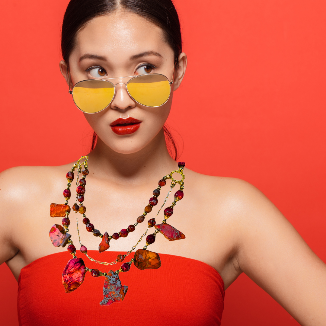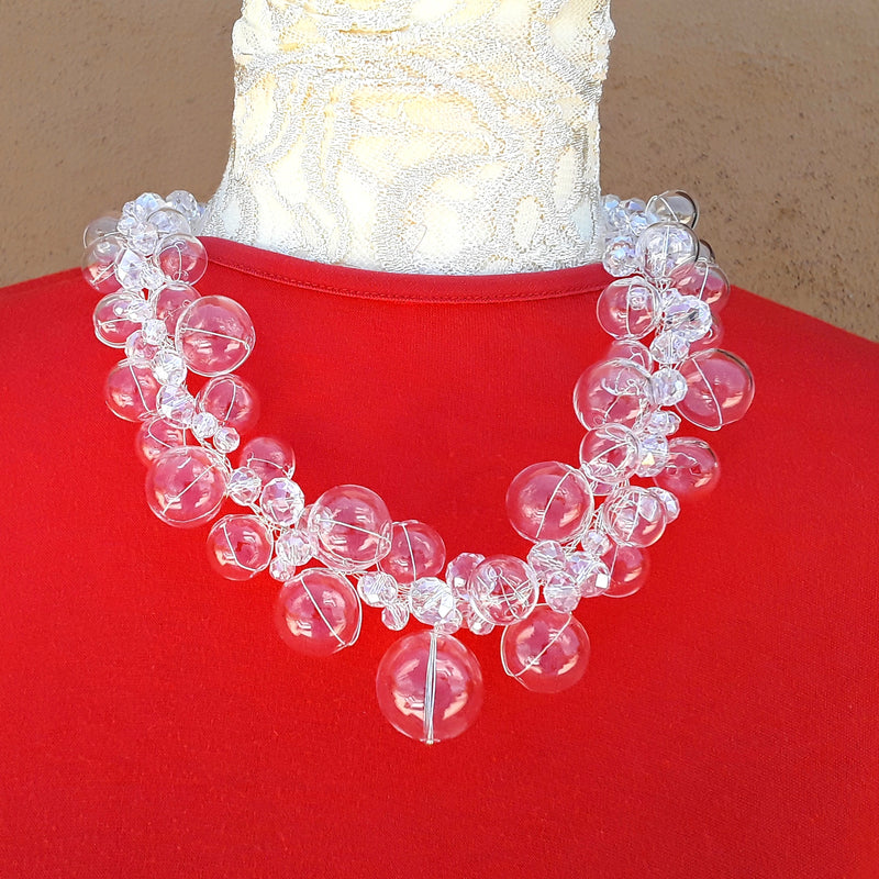Hand Blown Glass & Crystal Chunky Wire Statement Necklace - Unique Bubble Bib Gift for Her