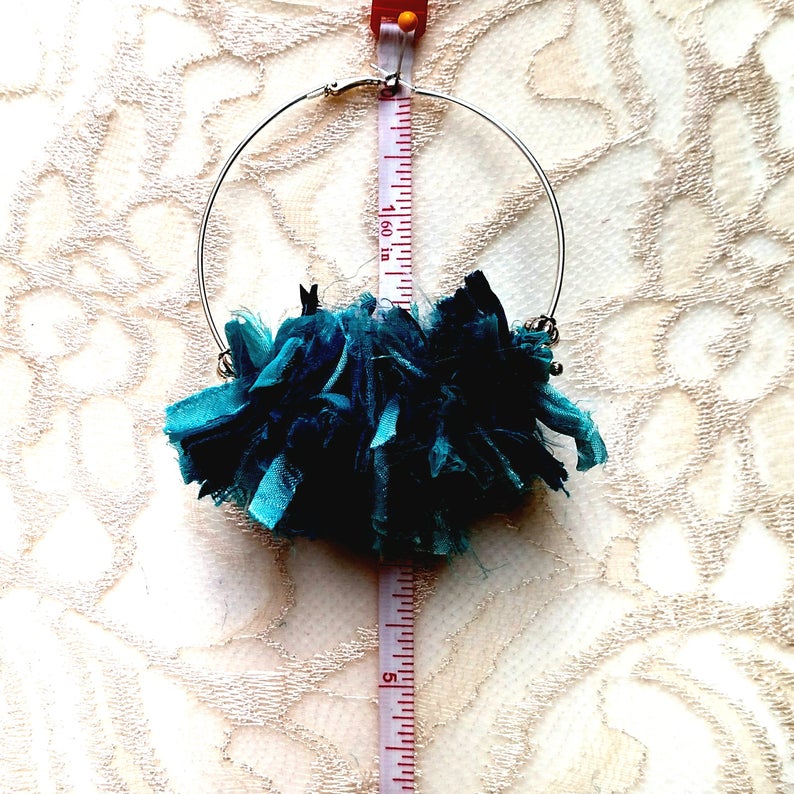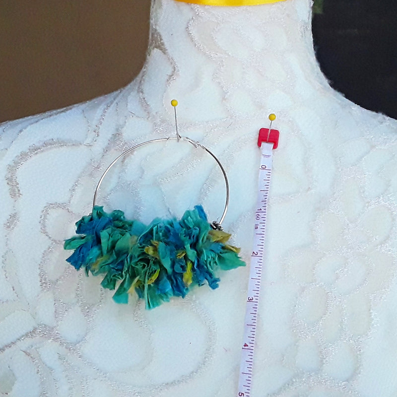 Huge Hoop Silver Plated Turquoise Statement Earrings - Sari Silk Boho Fabric Earrings