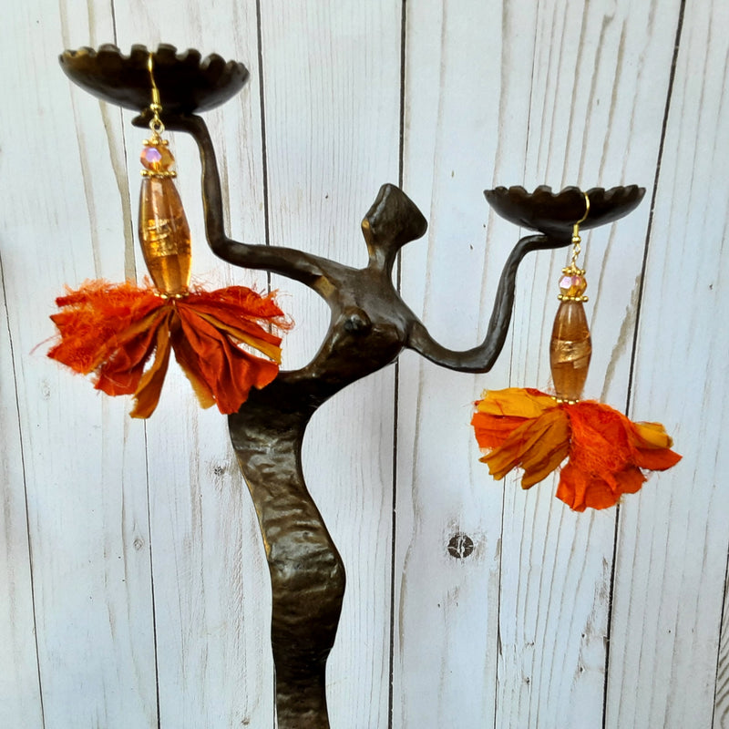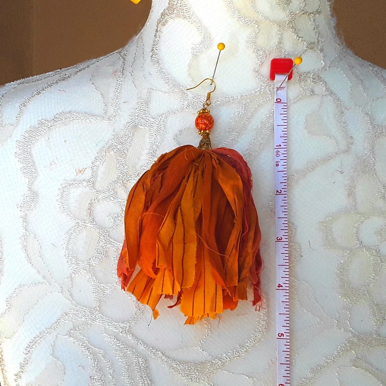 Orange Sari Silk Ribbon Tassel Dangle Statement Earrings - Fall Boho Fabric Earrings
