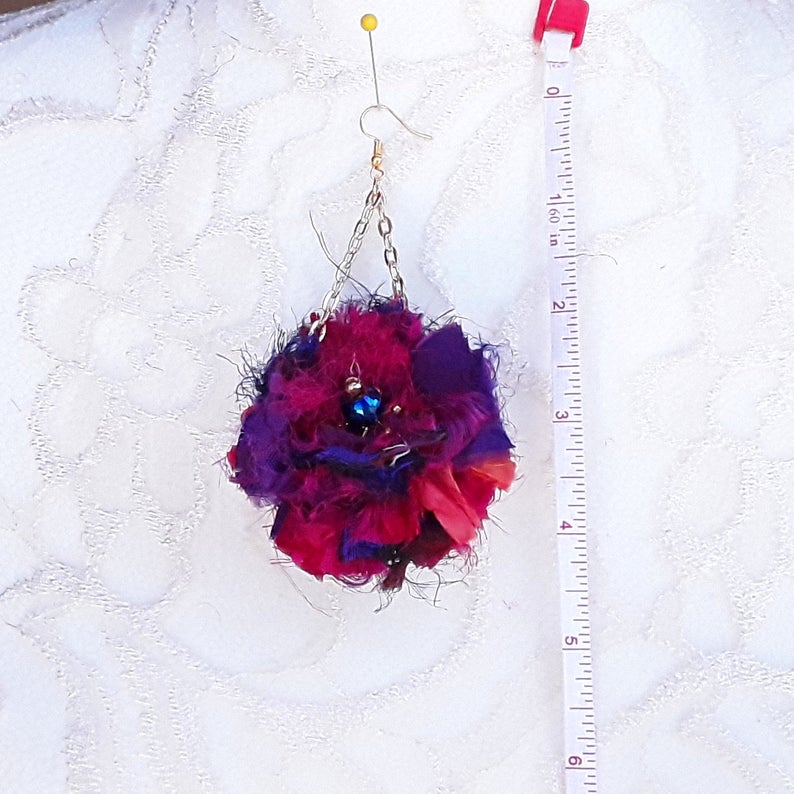 Jewel Tone Sari Silk Ribbon Dangle Flower Statement Earrings - Boho Fabric Earrings