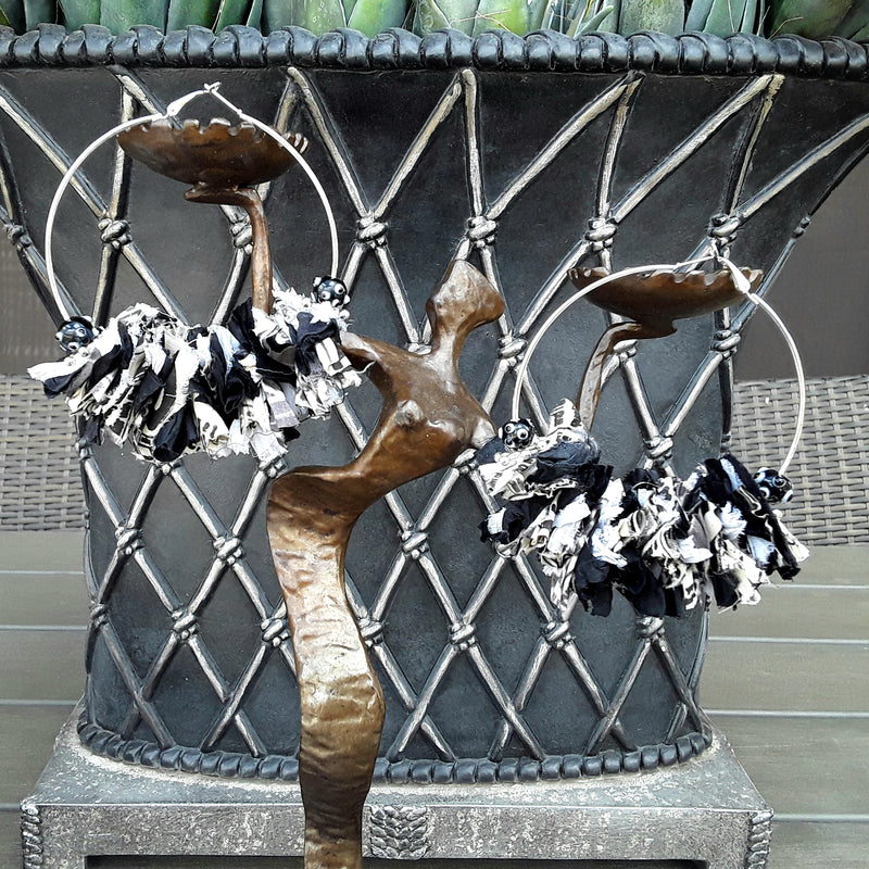 Black and White Huge Hoop Silver Statement Earrings - Sari Silk Boho Fabric Earrings