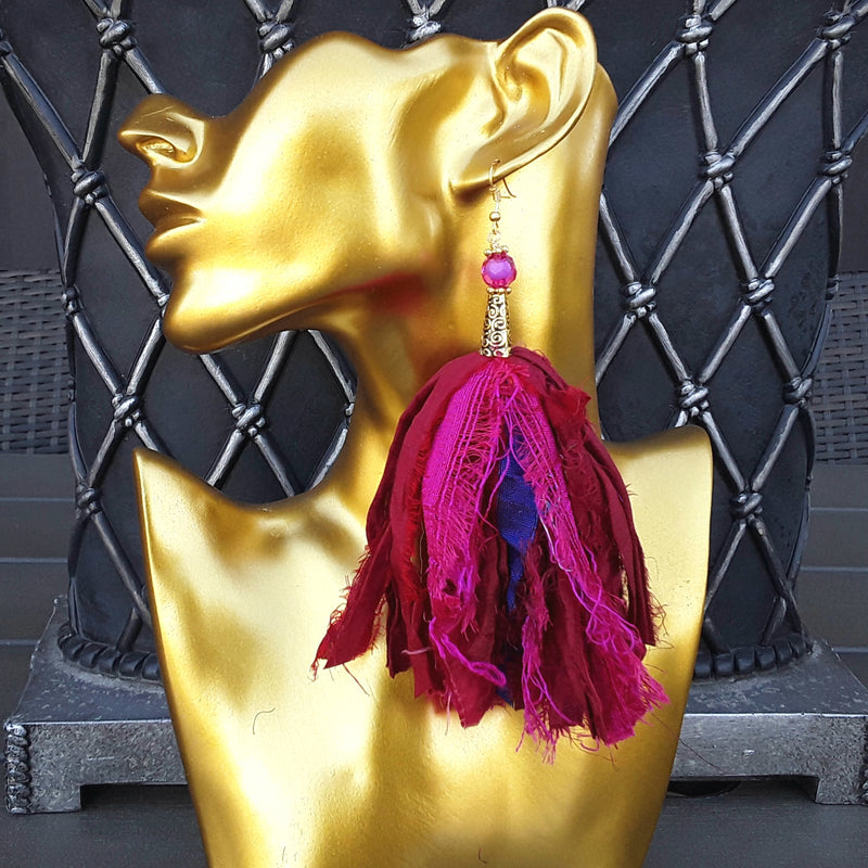 Fuchsia Sari Silk Ribbon Fuzzy Huge Boho Tassel Statement Earrings