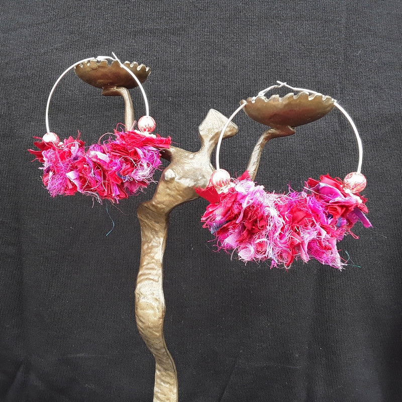 Fuschia Sari Silk Ribbon Huge Boho Gold or Silver Hoop Statement Earrings