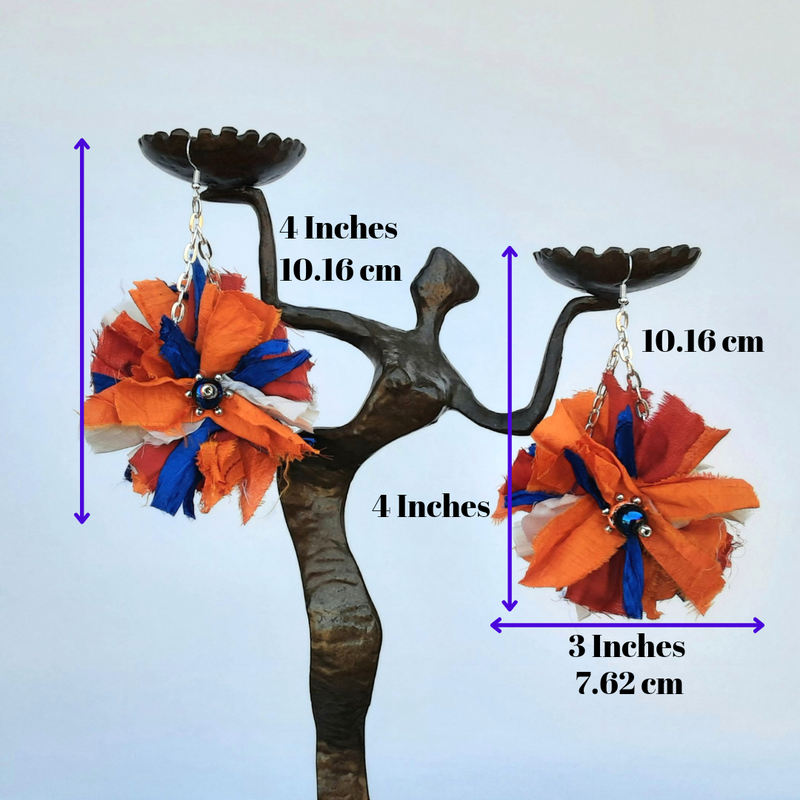 Burnt Orange Sari Silk Ribbon Dangle Flower Statement Earrings - Boho Fabric Earrings