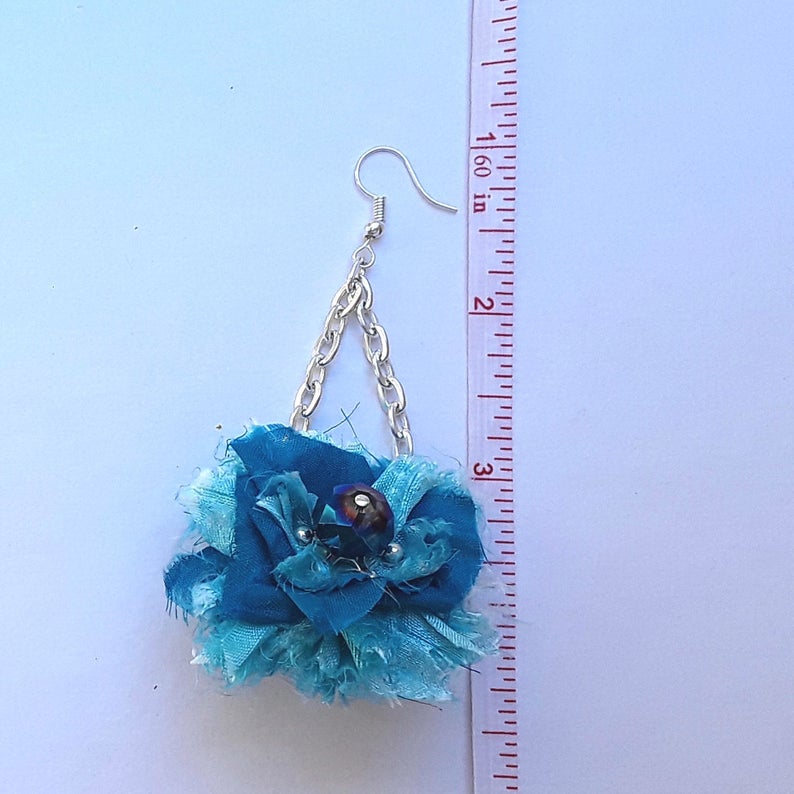 Turquoise Sari Silk Ribbon Dangle Flower Statement Earrings - Boho Fabric Earrings