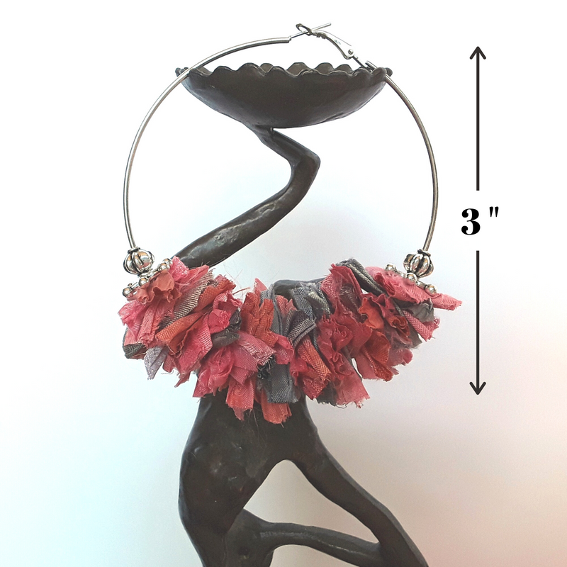 Sari Silk Ribbon Hoop Tassel Silver Plated Statement Earrings - Upcycled Boho Fabric Gift for Her
