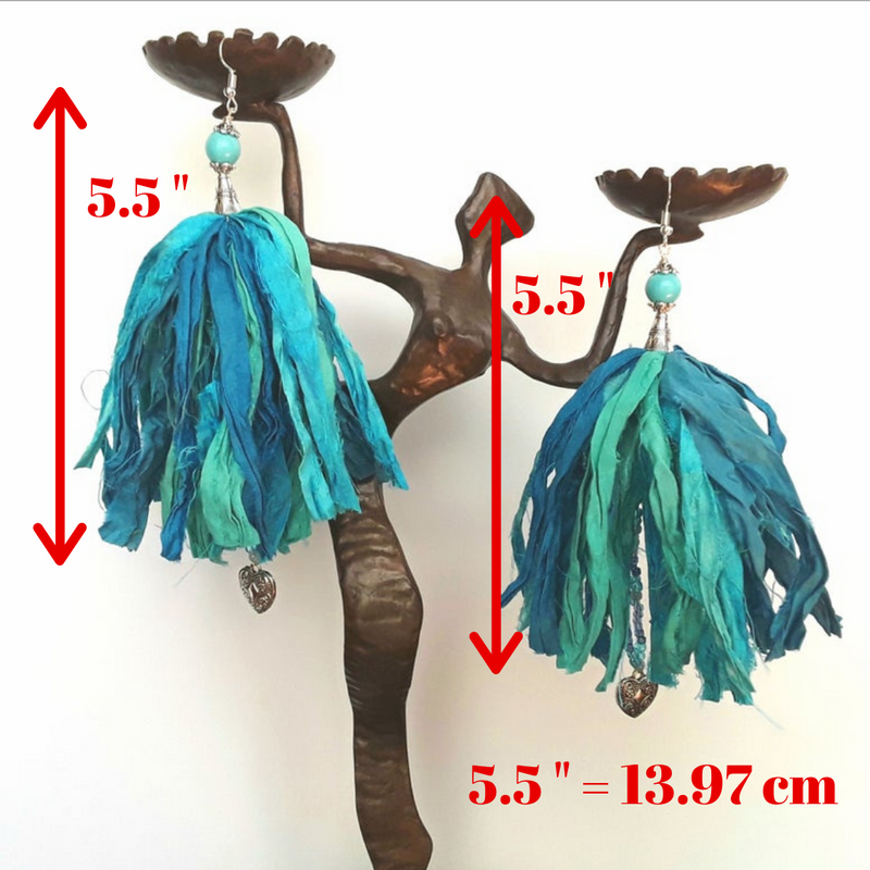 Turquoise Sari Ribbon Tassel Statement Earrings - Boho Fabric Earrings - Fun Fiber Earrings